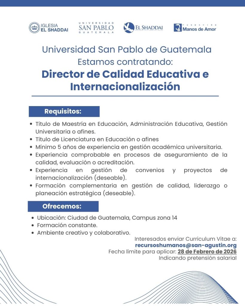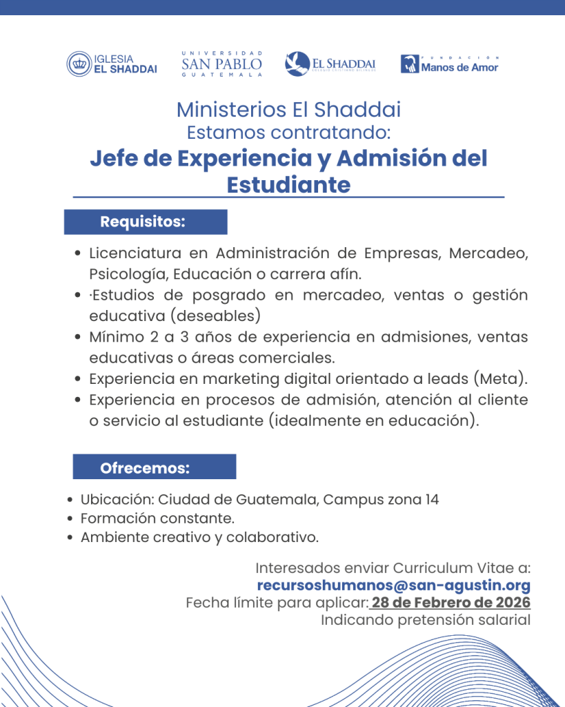 ¡Te damos la bienvenida a nuestra sección de Bolsa de Empleo, en donde encontrarás plazas disponibles propias de USPG, así como externas de la institución.Es importante mencionar que las plazas publicadas, se realizan de acuerdo a los perfiles de trabajo ingresados en nuestro portal, por las diferentes empresas participantes, las cuales han sido seleccionadas con la finalidad de brindarte opciones diversas y actualizadas del mercado laboral.Si deseas participar puedes enviar tu hoja de vida, la cual será revisada directamente por el representante de cada empresa, por lo que ellos se comunicarán directamente con las personas interesadas en participar en los procesos de selección.